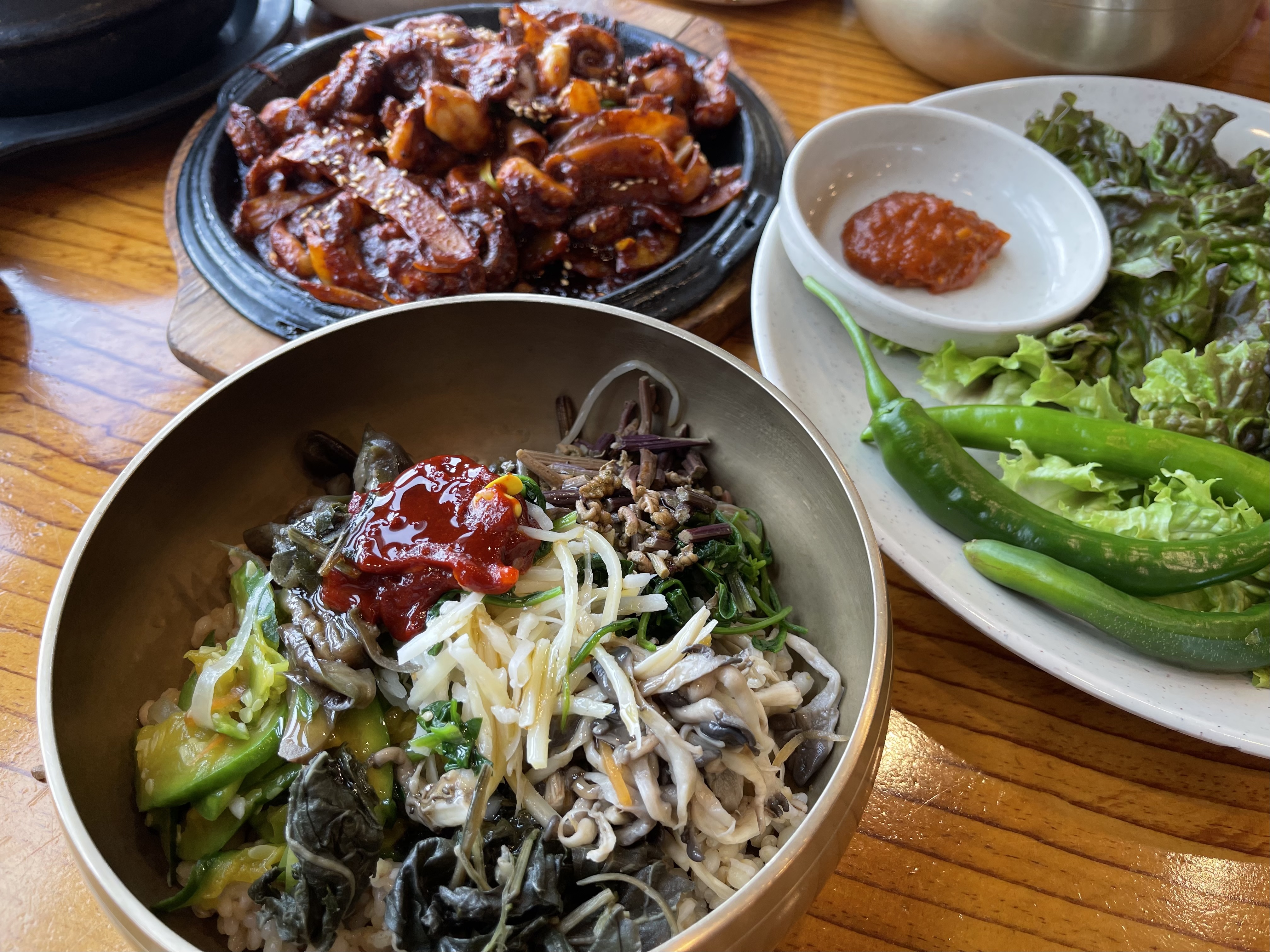 본격적인 메인 메뉴는 옛날 보리밥과 쭈꾸미볶음이었는데, 밥상 가득 찬 구성에 절로 감탄이 나왔어요. 보리밥과 함께 제공되는 나물 종류도 다양하고 신선했으며, 매콤한 쭈꾸미볶음과의 조합이 최고였어요.