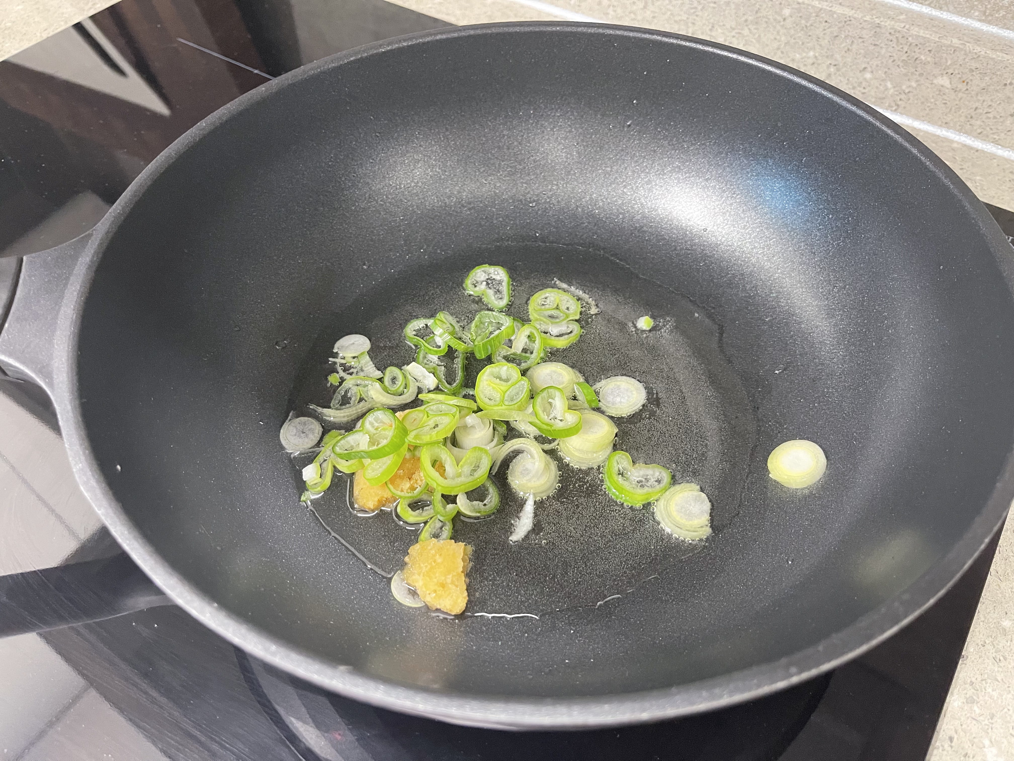In a pan with plenty of oil, sauté garlic and green onion first to bring out the aroma 👃