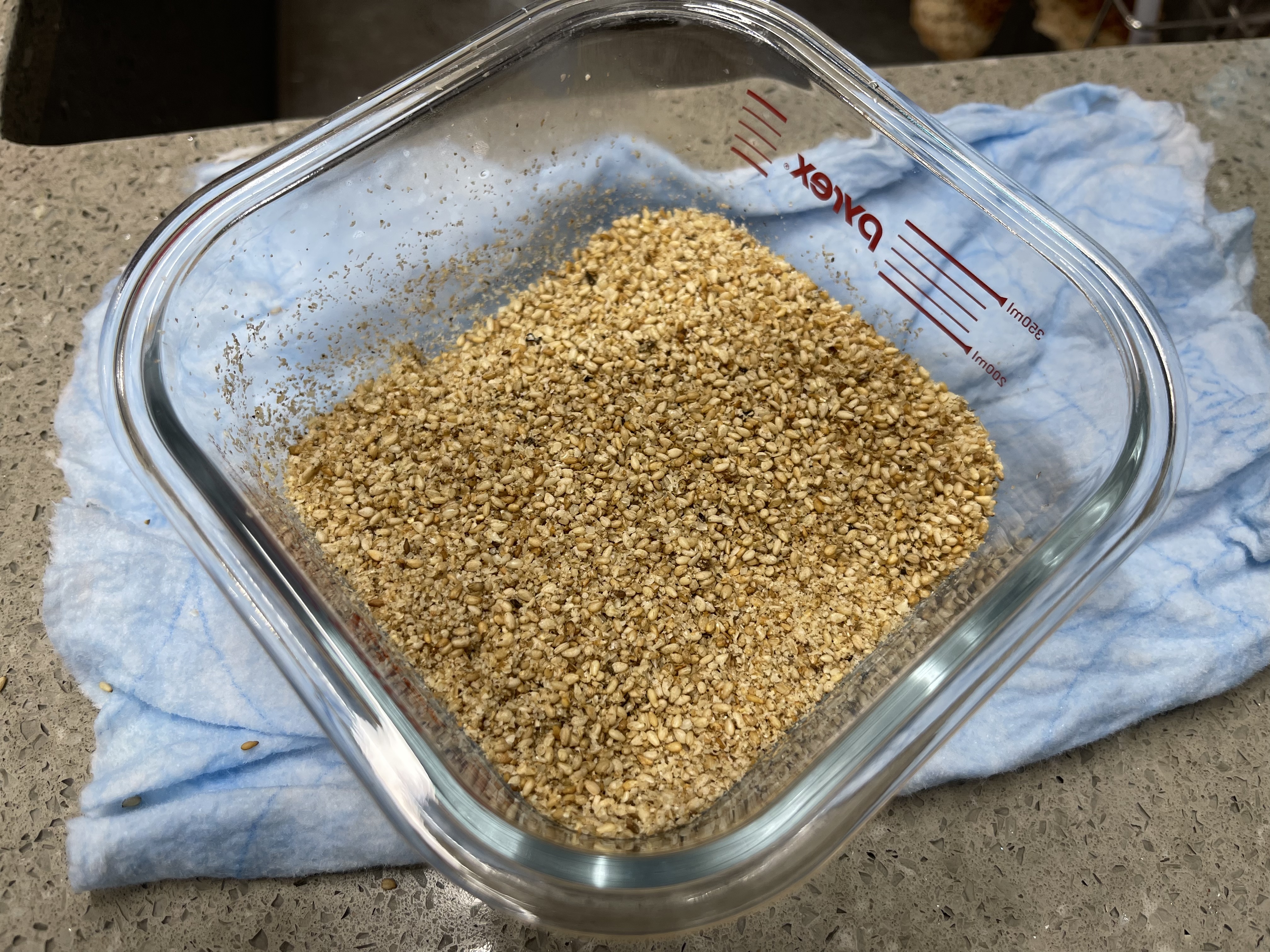 1️⃣ Start by adding sesame seeds into a glass or plastic storage container.
